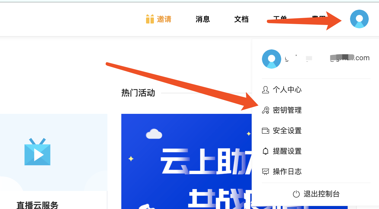 进入控制台后,点击右上角的个人头像,选择密钥管理去查看密钥,如下所示: