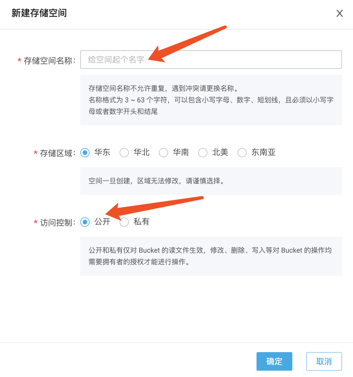 点击新建后,输入空间名,同时选择访问控制为公开,否则别人无法访问你的图片。