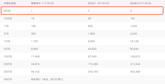 - 根据存储量收费,如下图所示,需要购买存储量,9 元 40 G 一年